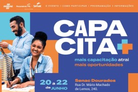 O Senac MS e o Sebrae/MS realizam nos dias 20 a 22 de junho, em Dourados, o Capacita +, evento gratuito voltado para a capacitação profissional, seja para quem quer empreender ou entrar para o mercado de trabalho. A iniciativa tem o apoio.