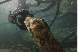 Daniel de Granville, operador e guia de expedições de passeios nas regiões de Bonito e do Pantanal no Mato Grosso do Sul, compartilhou imagens impressionantes da maior cobra brasileira no Instagram (@danieldegranville).O biólogo com pó.