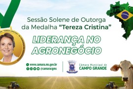 Os vereadores da Câmara Municipal de Campo Grande realizam, nesta sexta-feira (6), sessão solene de outorga da Medalha Tereza Cristina de Liderança no Agronegócio. O evento acontece a partir das 19h no Plenário Oliva Enciso, na sede da.