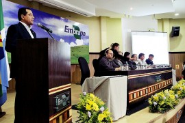 Durante a solenidade de assinatura do contrato com as empresas que farão a continuação das obras do Centro de Pesquisa e Reabilitação da Ictiofauna Pantaneira (Aquário do Pantanal), em Campo Grande.