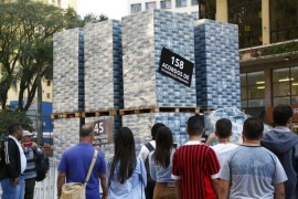 Uma pilha de dinheiro gigante, de 5 m de altura, chama a atenção de quem passa pela Boca Maldita, no calçadão da Rua XV de Novembro, o montante é equivalente a R$ 2 bilhões em cédulas fict&.