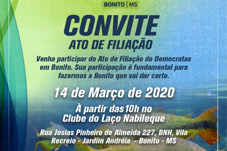 Em alta o Democratas no Mato Grosso do Sul, fará um ato de filiação na presença de diversos políticos, e demais correligionários na cidade de Bonito, o ato de filiação do partido DEM vai acontecer neste sábado 14, segundo a presidente do partido na cidade Ozair Bigaton, “estamos convidando a todos os bonitenses, para que juntos possamos fazer uma grande festa da Democracia, o DEM esta sempre de portas abertas para novas lideranças” disse Ozair.