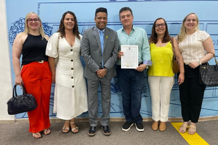 A homenagem foi entregue pelo vereador Professor Riverton, acompanhado pelo presidente da Casa de Leis, vereador Carlão e pelo 1° secretário, vereador Deley Pinheiro.