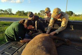 Policiais Militares Ambientais e Militares do Corpo de Bombeiros de Bonito, juntamente com veterinários e biólogos do Recinto de Amparo e Reabilitação de Animais Silvestres (RARAS) realizaram o resgate de uma anta atropelada. Uma equipe.