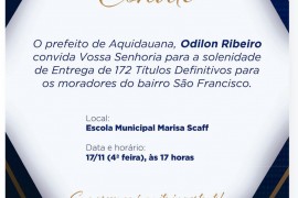 A Prefeitura Municipal de Aquidauana realizará, no dia 17 de novembro, às 17h, a solenidade para entrega de 172 títulos definitivos para os moradores do bairro São Francisco.O evento será realizado na Escola Municipal Marisa Scaff, e .