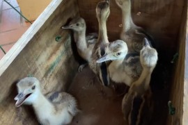 Policiais Militares Ambientais de Campo Grande receberam uma ligação de uma jovem de 19 anos que informava ter aparecido no quintal de sua residência seis filhotes de animal silvestre da espécie Rhea ameriana (ema). Os .