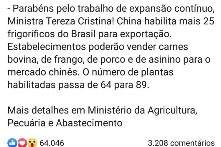 O presidente Jair Bolsonaro, parabenizou em sua rede social a ministra da Agricultura, Pecuária e Abastecimento, Tereza Cristina pela expansão no número de frigoríficos habilitados para exportação de carnes in natura para a China. O GACC , órgão de sanidade chinês, informou nesta segunda-feira (9), que mais 25 estabelecimentos do Brasil estão aptos para exportação, desses 2 são do Mato Grosso do Sul.