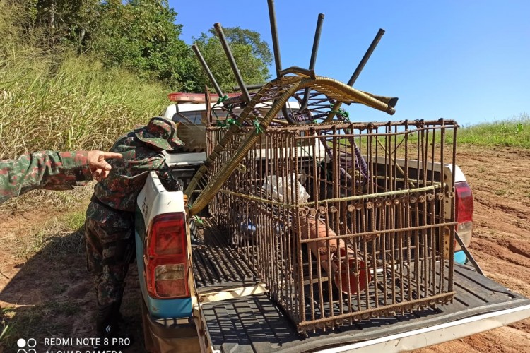 Foram apreendidas duas jaulas com 2 metros de comprimento utilizadas para captura de animais de grande porte, especialmente, porcos silvestres, bem como tubos de plásticos (PVC), com alimento, que serviam como cevas para atrair os animais. Além disso, havia cadeiras fixadas nos topos das árvores que serviam como observatório desses animais (espera), normalmente utilizadas, para abate dos bichos com arma de fogo.